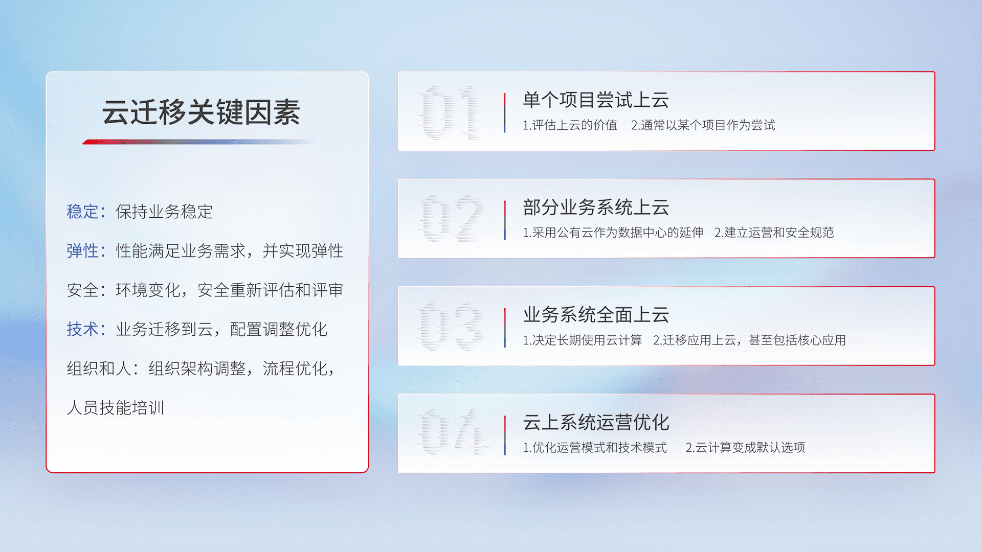 结合实际业务,,从规划设计、、云平台选型、、、、云原生改造、、、、数据迁移、、集成交付,,,,迁移全过程为客户识别最佳上云路径,,做好风险识别管理,,设计网络架构、、身份权限、、安全审计合规、、、操作审计、、、、日志审计、、、监控告警策略、、、、多站点容灾设计等,,,,对云上基础设施进行整体规划,,,,提升IT治理水平,,,以满足弹性、、高可用、、、、高性能的需求。。。。
