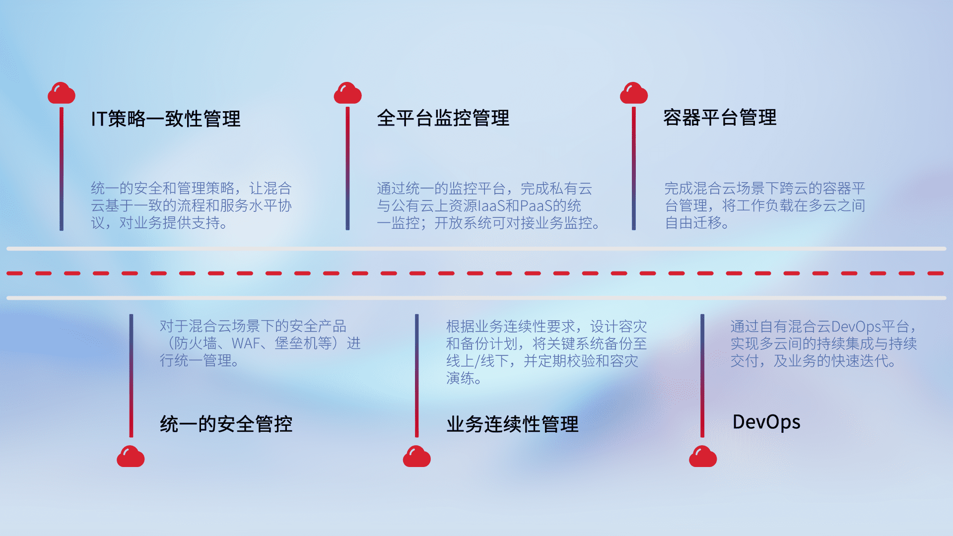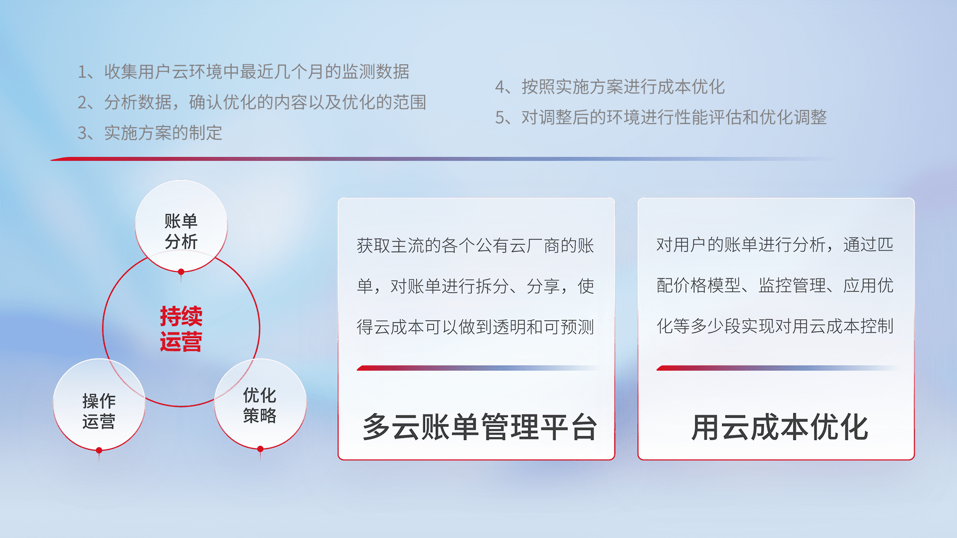 通过多云纳管,,以统一的资源数据模型把客户的云资源进行抽象和封装,,,,进而实现对多云资源的统一操作,,,,保障云资源管理的可靠性、、、、稳定性与可用性。。量身定制化运维内容,,配置、、、、开发运维、、、、补丁管理、、、备份、、、、监控、、、、认证和访问管理、、、审计和日常巡检等,,,,保障在用云过程中的可靠度,,稳定度以及高可用率。。。